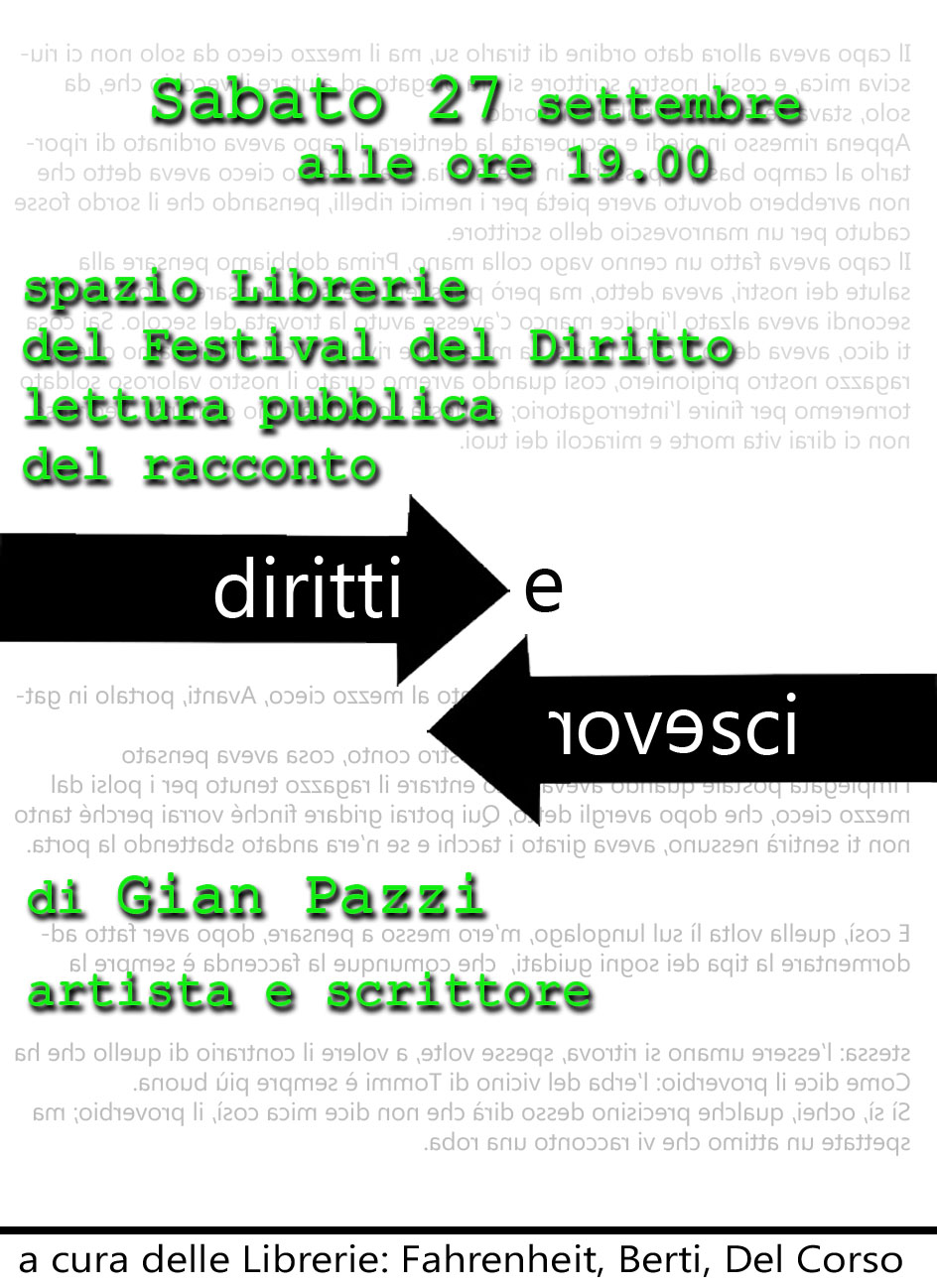 Lettura pubblica “Diritti e rovesci” All’interno del Festival del diritto 2014 di Piacenza, sabato 27/9 alle ore 19, la Libreria Fahrenheit 451 vi invita alla lettura pubblica del racconto “Diritti e rovesci” di Gian Pazzi. Condividi: Condividi su Facebook (Si apre in una nuova finestra) Facebook Condividi su X (Si apre in una nuova finestra) X Condividi su Pinterest (Si apre in una nuova finestra) Pinterest Condividi su WhatsApp (Si apre in una nuova finestra) WhatsApp Condividi su Telegram (Si apre in una nuova finestra) Telegram Condividi su LinkedIn (Si apre in una nuova finestra) LinkedIn Invia un link a un amico via e-mail (Si apre in una nuova finestra) E-mail I commenti sono chiusi.