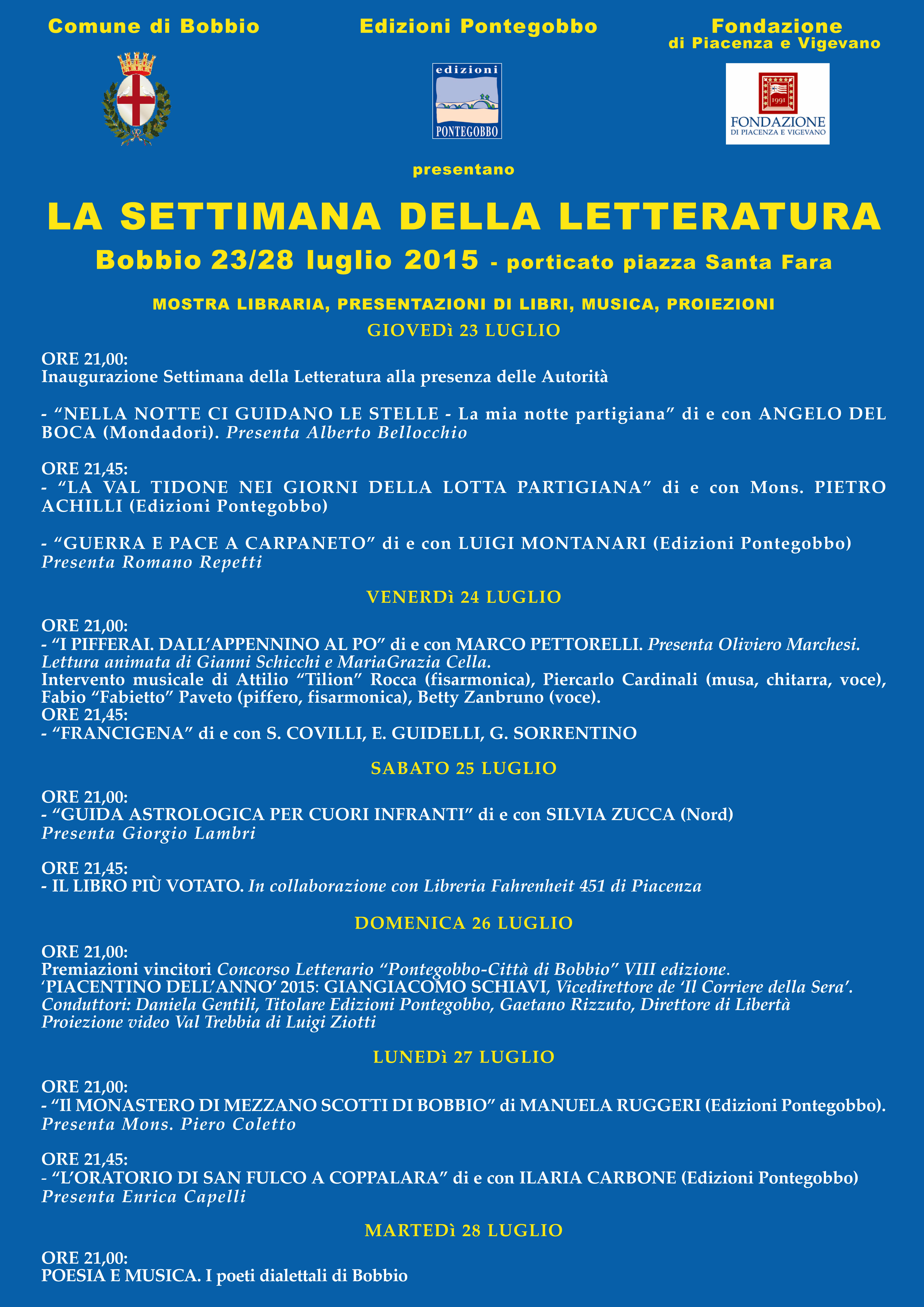 Settimana della letteratura a Bobbio La Libreria Fahrenheit 451 partecipa e vi invita alla settimana della letteratura di Bobbio. Ecco il programma completo (click per ingrandire): Condividi: Fai clic per condividere su Facebook (Si apre in una nuova finestra) Facebook Fai clic per condividere su X (Si apre in una nuova finestra) X Fai clic qui per condividere su Pinterest (Si apre in una nuova finestra) Pinterest Fai clic per condividere su WhatsApp (Si apre in una nuova finestra) WhatsApp Fai clic per condividere su Telegram (Si apre in una nuova finestra) Telegram Fai clic qui per condividere su LinkedIn (Si apre in una nuova finestra) LinkedIn Fai clic per inviare un link a un amico via e-mail (Si apre in una nuova finestra) E-mail I commenti sono chiusi.