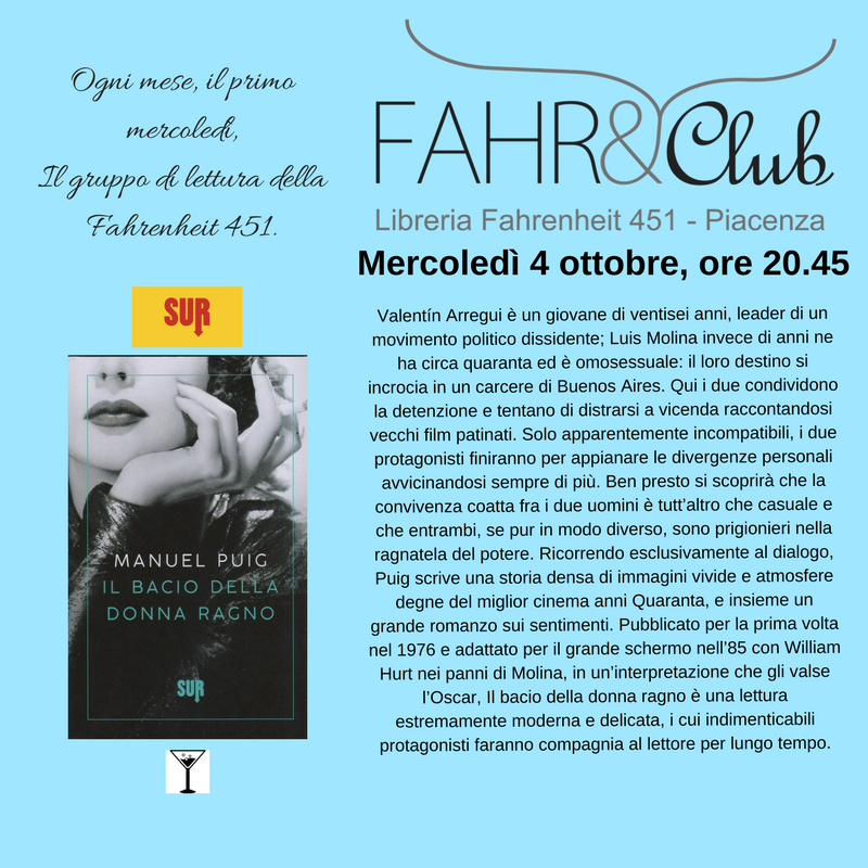 Mercoledì 3 ottobre alle ore 20:45 Fahr&club, il gruppo di lettura della libreria Fahrenheit 451, affronterà il libro “Il bacio della donna ragno” di Manuel Puig (Sur edizioni). Durante l’incontro si discuterà del libro e delle sue tematiche leggendone anche brevi passaggi; non è obbligatorio aver letto il libro, la serata serve anche per far venir voglia di leggerlo. A condurre la serata Sara Carini.