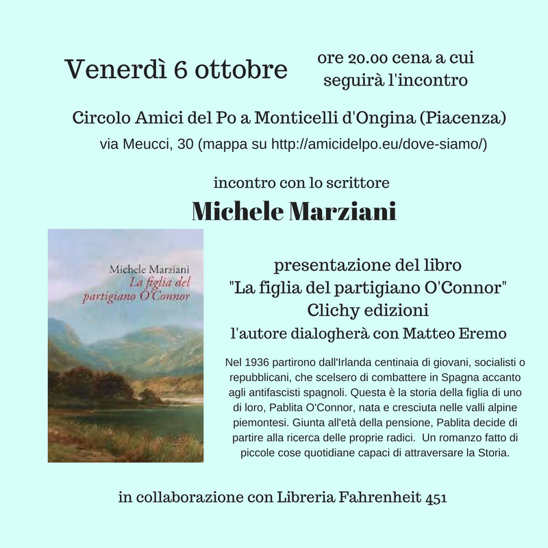 Venerdì sera 6/10/17 non perdete l’incontro a Monticelli d’Ongina con lo scrittore Michele Marziani che presenta il suo romanzo, basato su fatti storici, “La figlia del Partigiano O’Connor“, l’autore dialogherà con Matteo Eremo.
