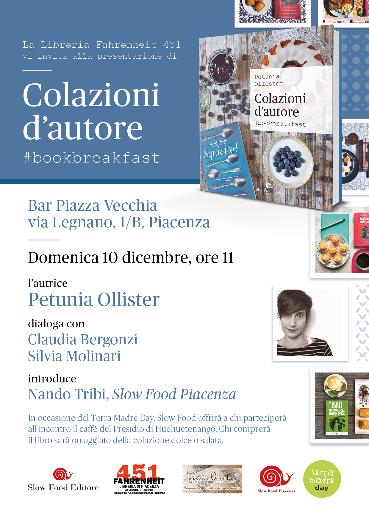 “Colazione con l’autore” domenica 10 dicembre alle ore 11 in via Legnano, libreria Fahrenheit 451 in collaborazione con Slow Food Piacenza in occasione del terra Madre day organizza presso il Bar Piazza Vecchia (via legnano 1/B) la presentazione del volume “Colazioni d’autore” con l’autrice, la giornalista e blogger Petunia Ollister. Dialogheranno con lei Claudia Bergonzi e Silvia Molinari, introdurrà Nando Tribi. A chi comprerà il libro verrà offerta la colazione dolce o salata e a tutti i partecipanti il caffè del presidio Slow Food Huehuetenango.