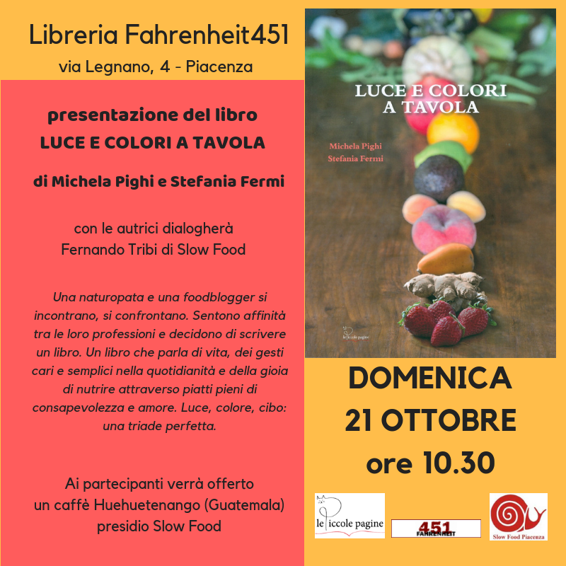 Domenica 21 ottobre alle ore 10.30, presso la libreria Fahrenheit 451, Slow Food vi offre un buonissimo caffè Huehuetenango (presidio Slow Food del Guatemala) insieme alla presentazione di un libro bello e originale “LUCE E COLORI A TAVOLA” con le autrici Michela Pighi e Stefania Fermi.