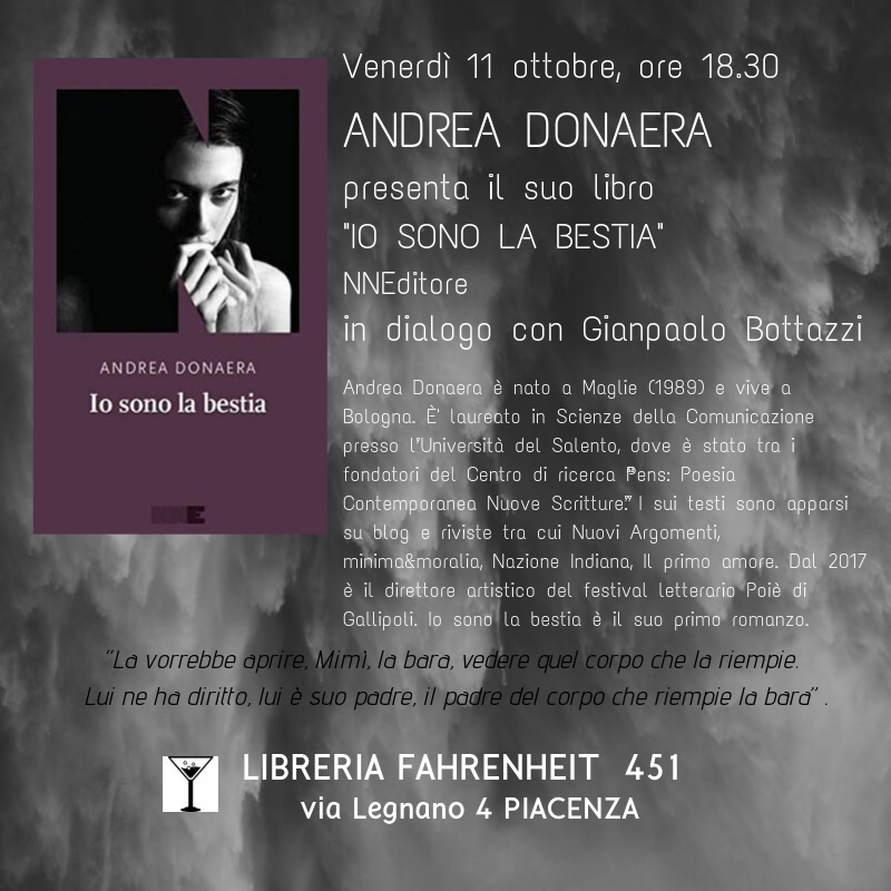 Venerdì 11 ottobre alle ore 18,30 appuntamento con Andrea Donaera autore del libro “IO SONO LA BESTIA” NNEditore. L’autore ne parlerà con Gianpaolo Bottazzi, brani interpretati da Valeria Laffeni.