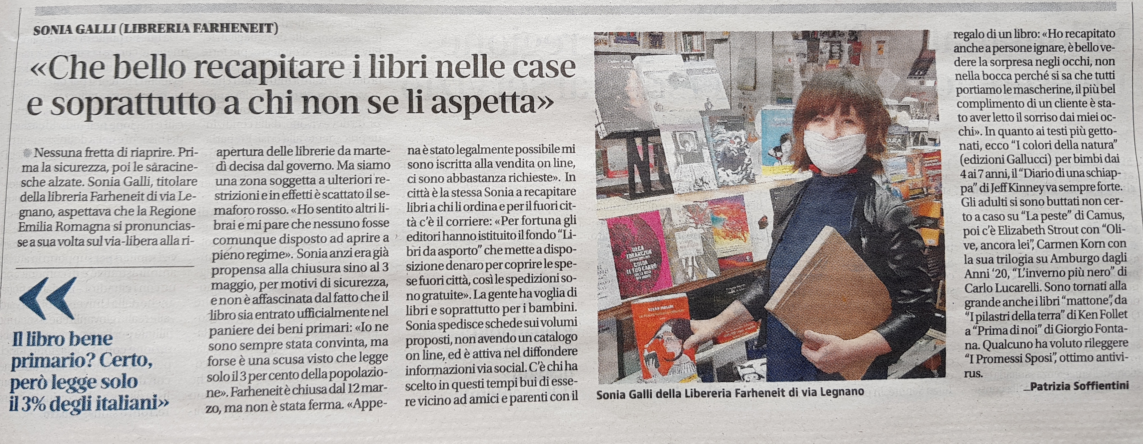 Intervista a Sonia Vi riportiamo l’intervista a Sonia in merito alle consegne a domicilio effettuate in questo periodo dalla Libreria Fahrenheit 451. L’articolo è sul quotidiano Libertà di oggi. Condividi: Fai clic per condividere su Facebook (Si apre in una nuova finestra) Facebook Fai clic per condividere su X (Si apre in una nuova finestra) X Fai clic qui per condividere su Pinterest (Si apre in una nuova finestra) Pinterest Fai clic per condividere su WhatsApp (Si apre in una nuova finestra) WhatsApp Fai clic per condividere su Telegram (Si apre in una nuova finestra) Telegram Fai clic qui per condividere su LinkedIn (Si apre in una nuova finestra) LinkedIn Fai clic per inviare un link a un amico via e-mail (Si apre in una nuova finestra) E-mail I commenti sono chiusi.