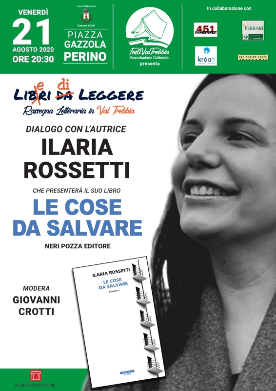 Incontro con l’autrice Ilaria Rossetti Incontro a Perino (PC) con Ilaria Rossetti, autrice de “Le cose da salvare” (Neri Pozza), in collaborazione con Libreria Fahrenheit 451. Condividi: Fai clic per condividere su Facebook (Si apre in una nuova finestra) Facebook Fai clic per condividere su X (Si apre in una nuova finestra) X Fai clic qui per condividere su Pinterest (Si apre in una nuova finestra) Pinterest Fai clic per condividere su WhatsApp (Si apre in una nuova finestra) WhatsApp Fai clic per condividere su Telegram (Si apre in una nuova finestra) Telegram Fai clic qui per condividere su LinkedIn (Si apre in una nuova finestra) LinkedIn Fai clic per inviare un link a un amico via e-mail (Si apre in una nuova finestra) E-mail I commenti sono chiusi.
