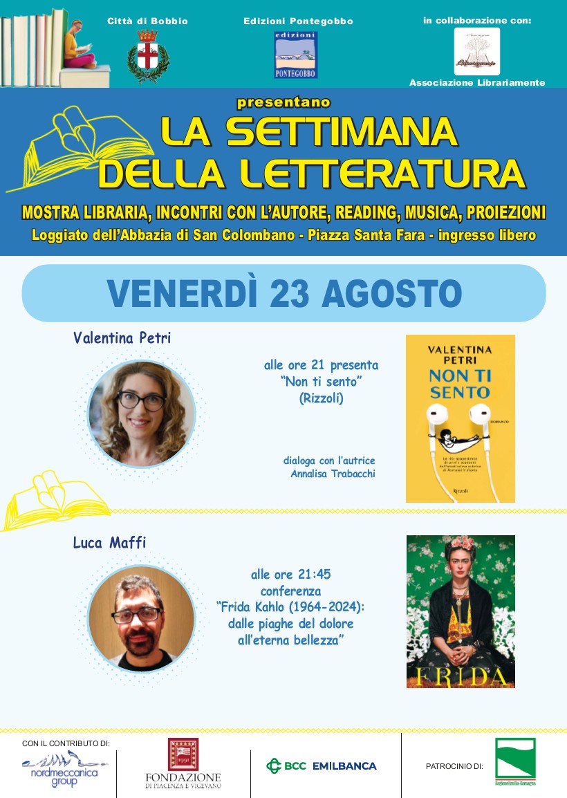 Nell’ambito della Settimana della letteratura di Bobbio, venerdì 23 agosto 2024 si terranno gli incontri con Valentina Petri autrice di “Non ti sento” (ed. Rizzoli), e Luca Maffi che terrà una conferenza su Frida Kahlo.