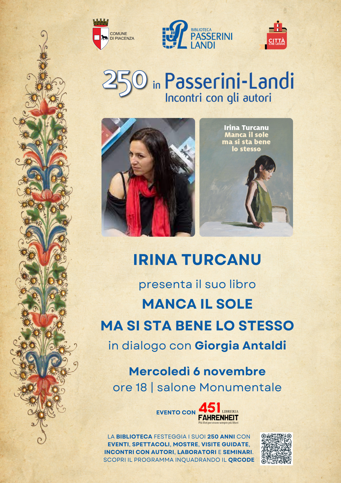 Mercoledì 6 novembre 2024 ore 18.00, nel salone monumentale della biblioteca Passerini Landi di Piacenza, Irina Turcanu presenterà il suo libro “Manca il sole ma si sta bene lo stesso” (Marsilio).