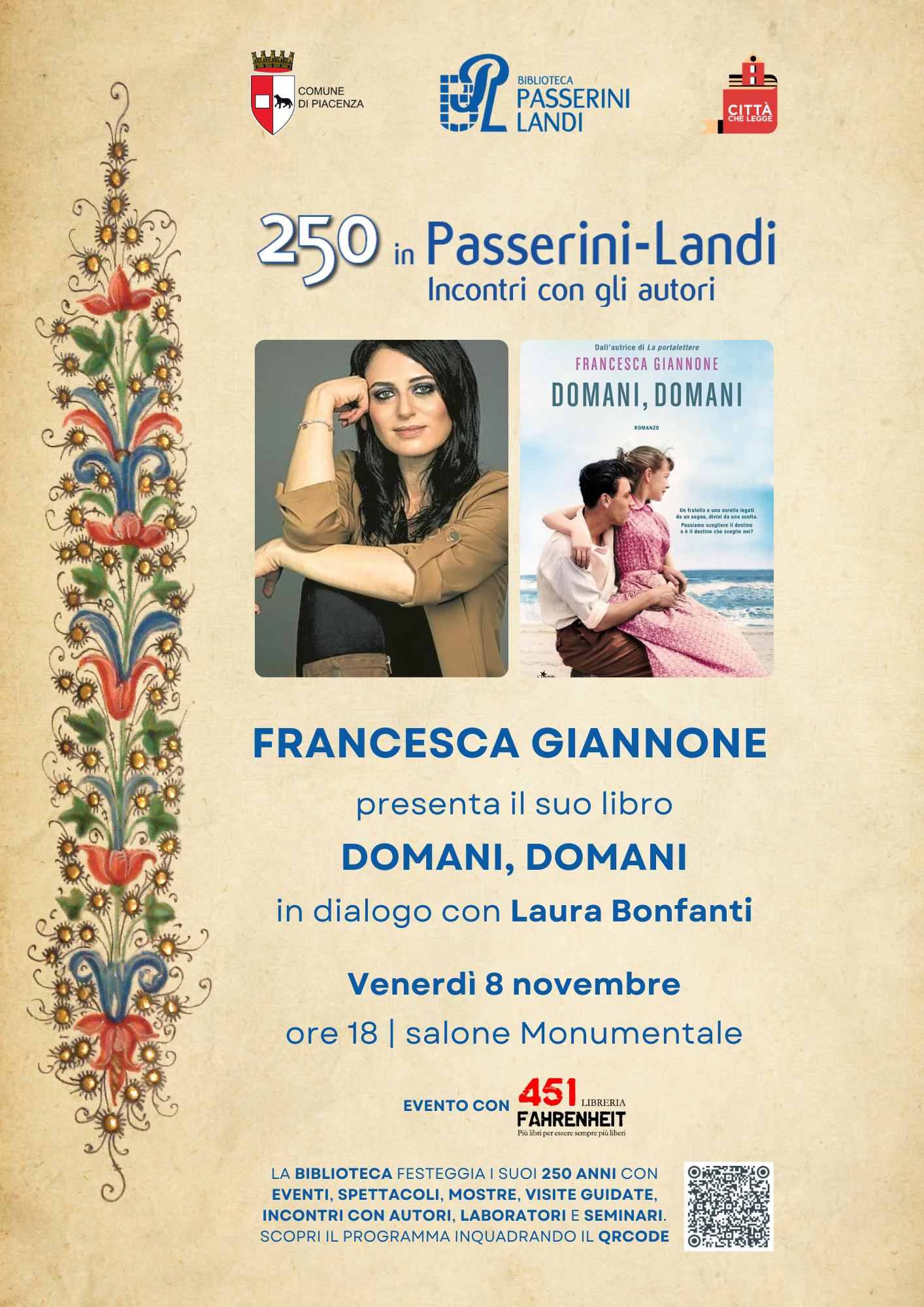 Venerdì 8 novembre 2024 ore 18.00, nel salone monumentale della biblioteca Passerini Landi di Piacenza, Francesca Giannone presenterà il suo libro “Domani, domani” (ed. Nord).
