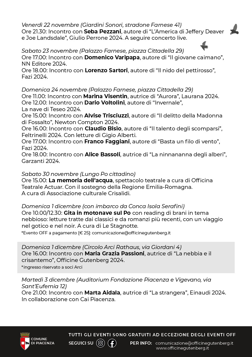 Prossimi appuntamenti del weekend e programma completo fino al 3 dicembre 2024.