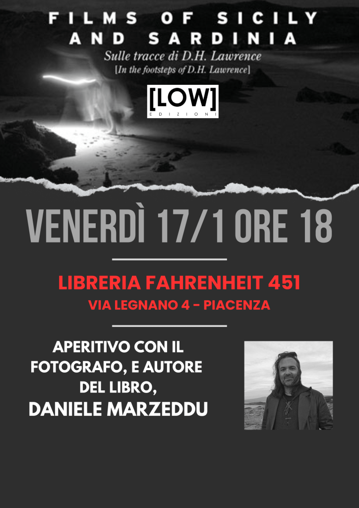 VENERDI’ 17 gennaio alle ore 18, alla libreria FAHRENHEIT 451, aperitivo con il fotografo DANIELE MARZEDDU per l’uscita del suo libro “FILMS OF SICILY AND SARDINIA. SULLE TRACCE DI D.H. LAWRENCE“, (LOW EDIZIONI).