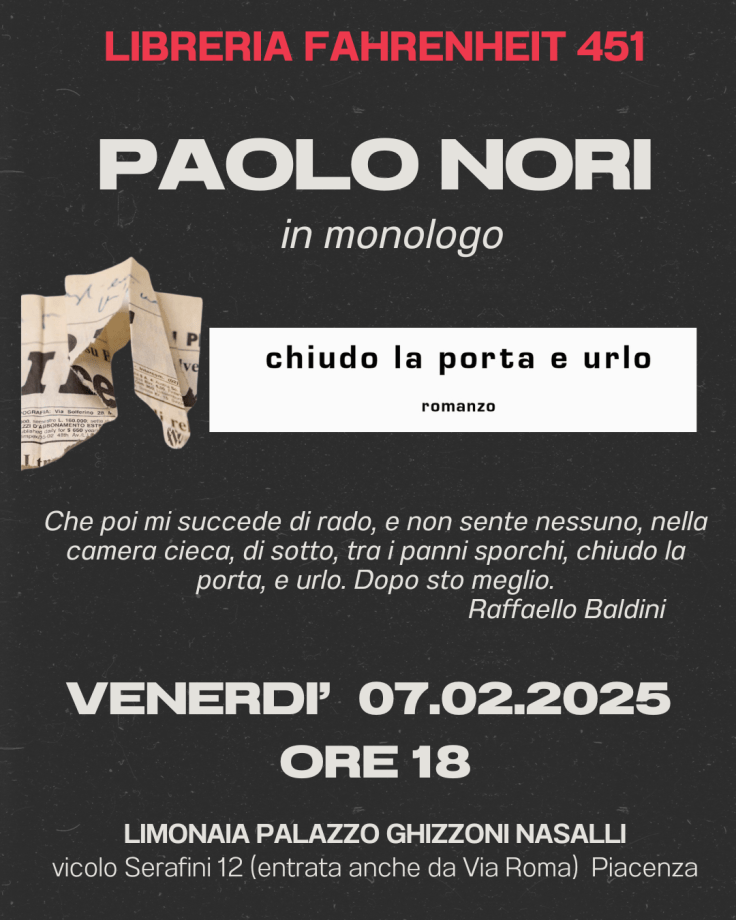 La Libreria Fahrenheit 451 vi invita all’incontro con Paolo Nori, autore di “Chiudo la porta e urlo” (Mondadori), in monologo presso la Limonaia di Palazzo Ghizzoni Nasalli in vicolo Serafini 12, entrata anche da via Roma, Piacenza.