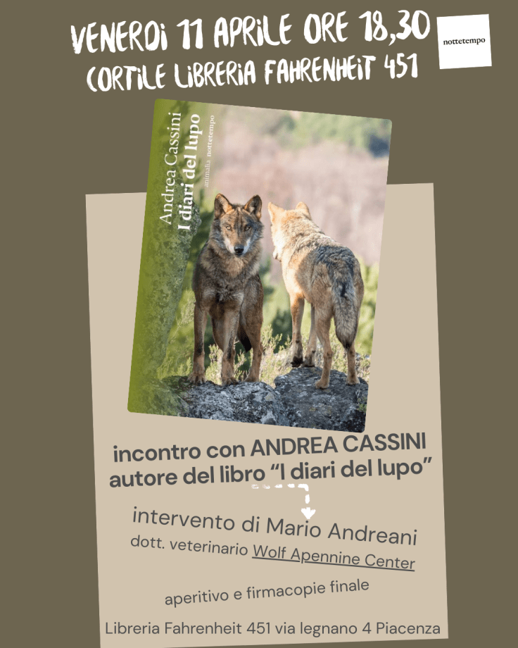 Venerdì 11 aprile alle ore 18:30, nel cortile della libreria Fahrenheit 451, si parla del tema attuale del ritorno dei lupi nel nostro Appennino, con un incontro dedicato al libro “I diari del lupo” edito da Nottetempo, con l’autore Andrea Cassini e l’intervento del dott. Mario Andreani del Wolf Appenine center.