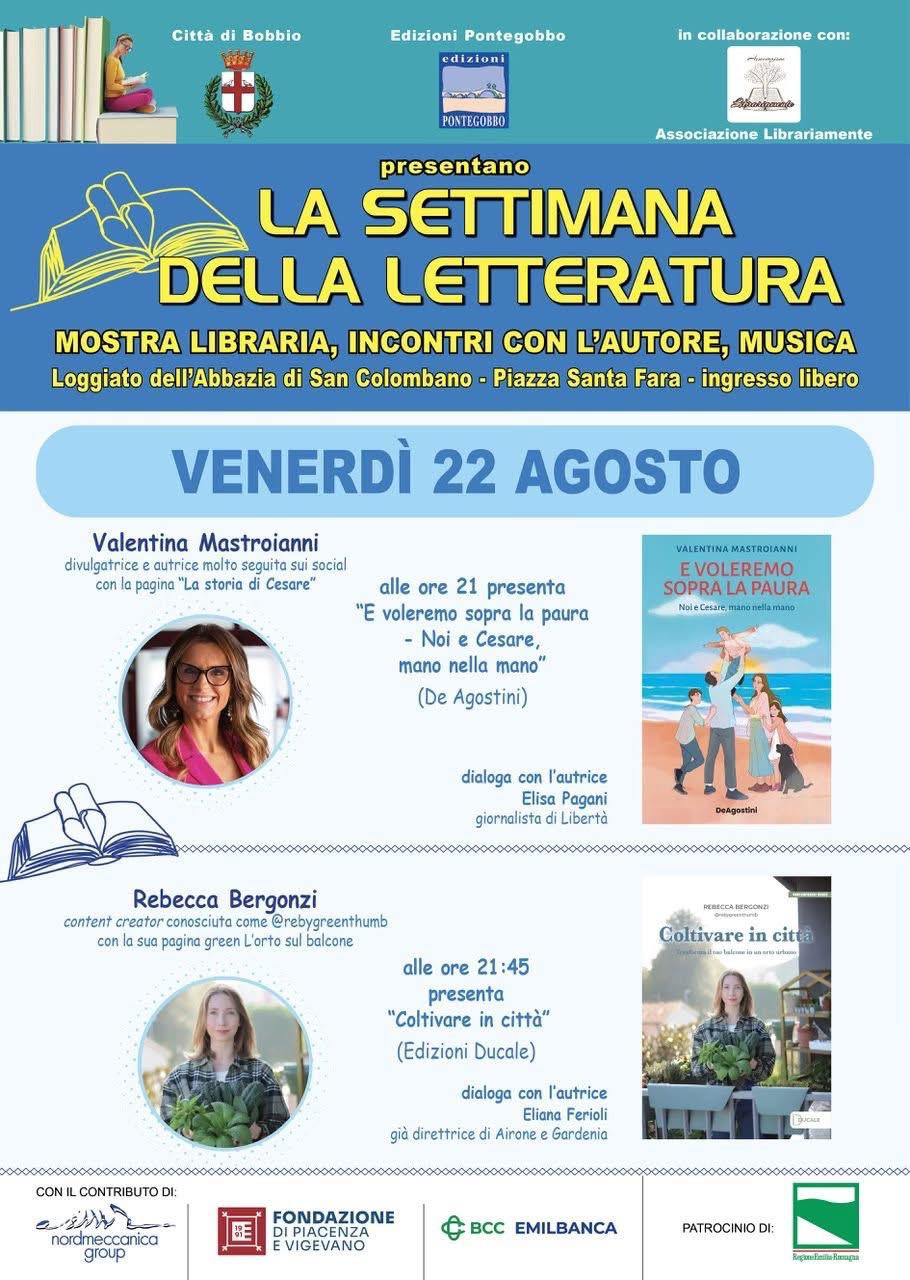 Venerdì 22 agosto, all’interno della “Settimana della letteratura” di Bobbio -PC-, incontro con Valentina Mastroianni, autrice del libro “E voleremo sopra la paura” (Ed. De Agostini), e Rebecca Bergonzi, autrice del libro “Coltivare in città” (ed. Ducale).