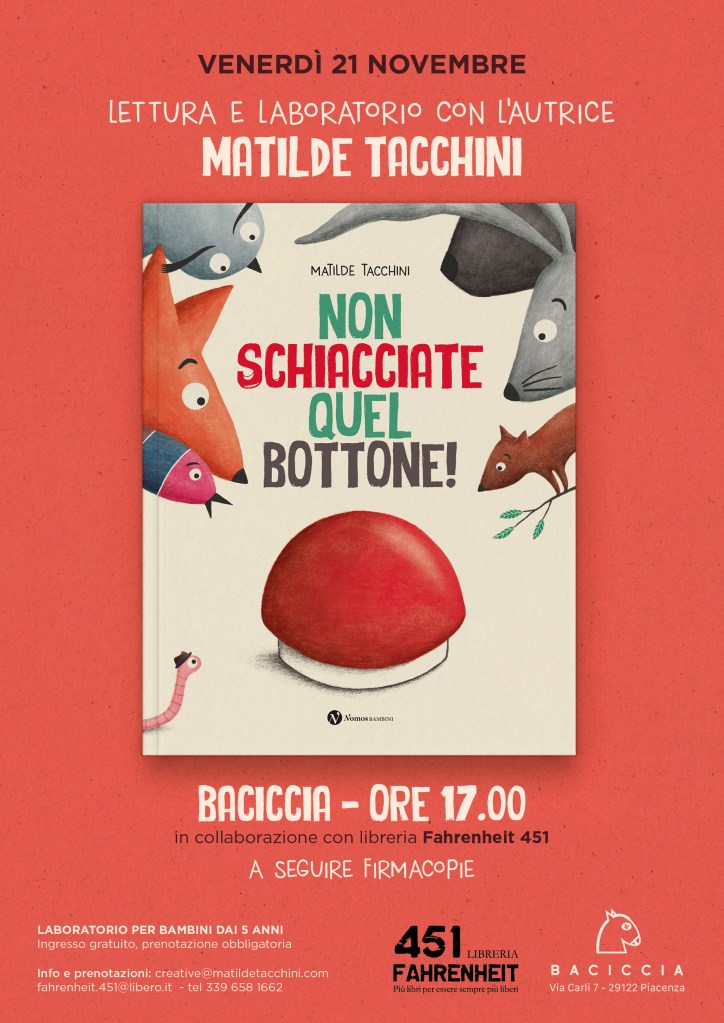 Venerdì 21 novembre 2025 ore 17, presso il locale Baciccia di Piacenza, incontro di lettura e laboratorio con Matilde Tacchini, autrice di “Non schiacciate quel bottone!” (Nomos Bambini).