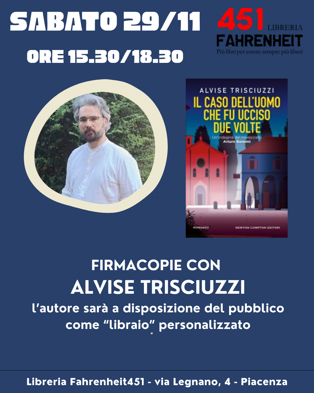 Incontro con l’autore Trisciuzzi Sabato 29 novembre 2025, presso la Libreria Fahrenheit 451, Alvise Trisciuzzi sarà presente dalle ore 15.30 alle 18.30 come “libraio personalizzato” e per il firmacopie del suo libro “Il caso dell’uomo che fu ucciso due volte” (Newton Compton). Condividi: Fai clic per condividere su Facebook (Si apre in una nuova finestra) Facebook Fai clic per condividere su X (Si apre in una nuova finestra) X Fai clic qui per condividere su Pinterest (Si apre in una nuova finestra) Pinterest Fai clic per condividere su WhatsApp (Si apre in una nuova finestra) WhatsApp Fai clic per condividere su Telegram (Si apre in una nuova finestra) Telegram Fai clic qui per condividere su LinkedIn (Si apre in una nuova finestra) LinkedIn Fai clic per inviare un link a un amico via e-mail (Si apre in una nuova finestra) E-mail I commenti sono chiusi.