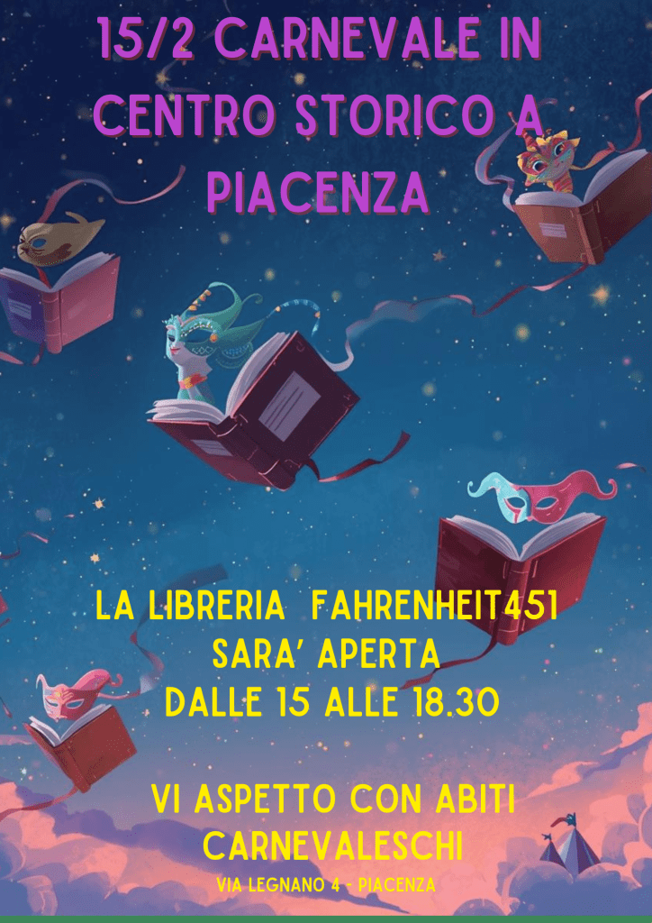 Carnevale in centro storico a Piacenza Domenica 15 febbraio 2026 la libreria Fahrenheit 451 sarà aperta dalle 15 alle 18,30 e vi aspetta con abiti carnevaleschi. Condividi: Condividi su Facebook (Si apre in una nuova finestra) Facebook Condividi su X (Si apre in una nuova finestra) X Condividi su Pinterest (Si apre in una nuova finestra) Pinterest Condividi su WhatsApp (Si apre in una nuova finestra) WhatsApp Condividi su Telegram (Si apre in una nuova finestra) Telegram Condividi su LinkedIn (Si apre in una nuova finestra) LinkedIn Invia un link a un amico via e-mail (Si apre in una nuova finestra) E-mail I commenti sono chiusi.
