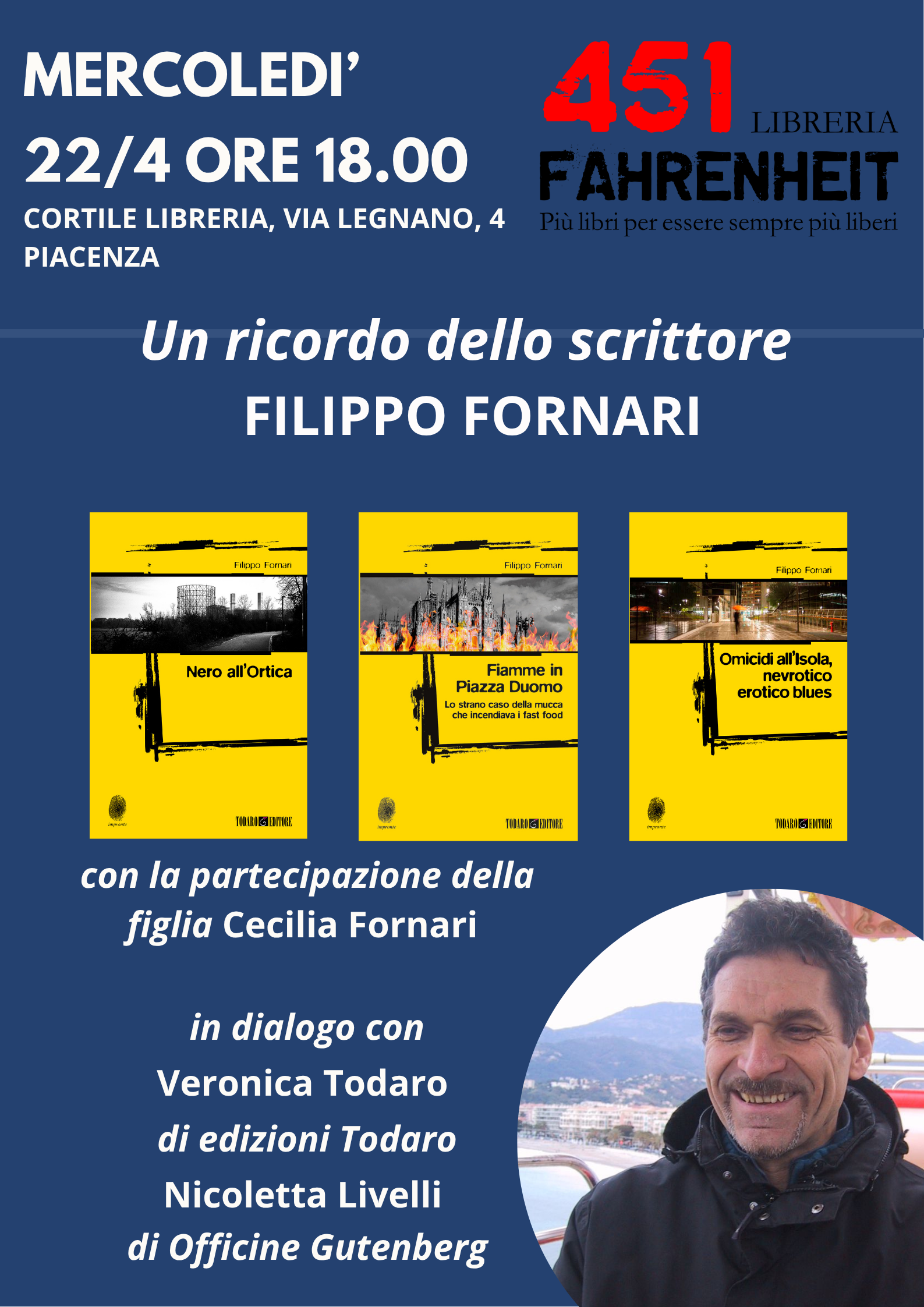 Mercoledì 22 aprile alle ore 18, per il ciclo “Il cortile dei libri viventi”, alla libreria Fahrenheit 451 si terrà un omaggio allo scrittore piacentino Filippo Fornari, mancato nel 2025, con la presenza della figlia Cecilia Fornari e i suoi editori Veronica Todaro (Todaro edizioni) e Nicoletta Livelli (edizioni Gutenberg).