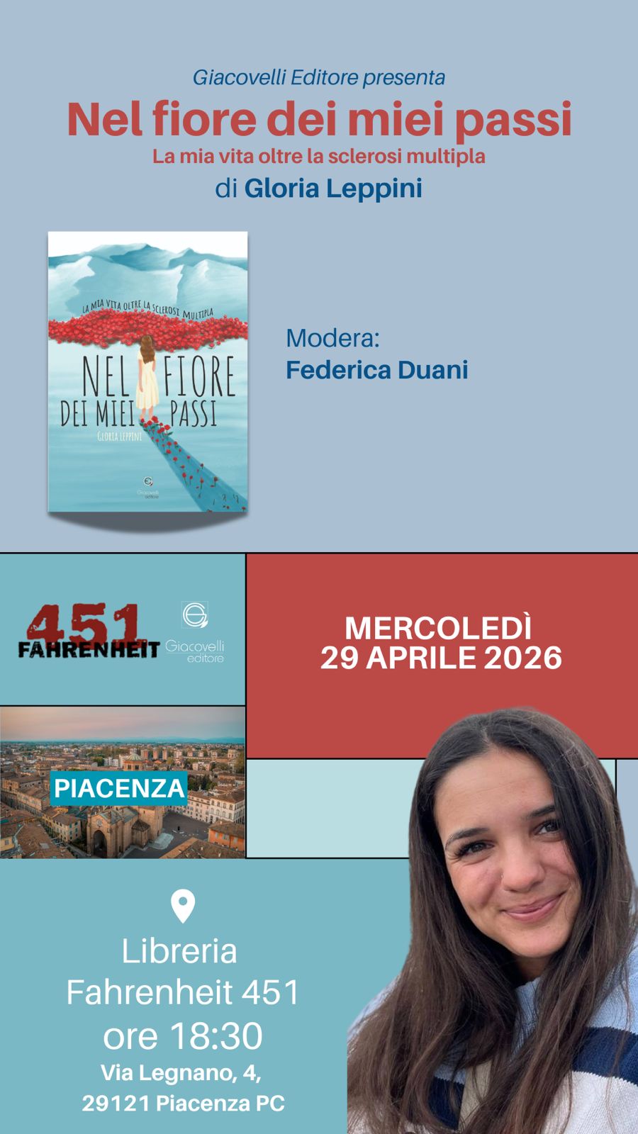 Mercoledì 29 aprile 2026 alle ore 18.30 presso il cortile della Libreria Fahrenheit 451, per il ciclo “Il cortile dei libri viventi”, incontro con Gloria Leppini, autrice del libro “Nel fiore dei miei passi – La mia vita oltre la sclerosi multipla”.